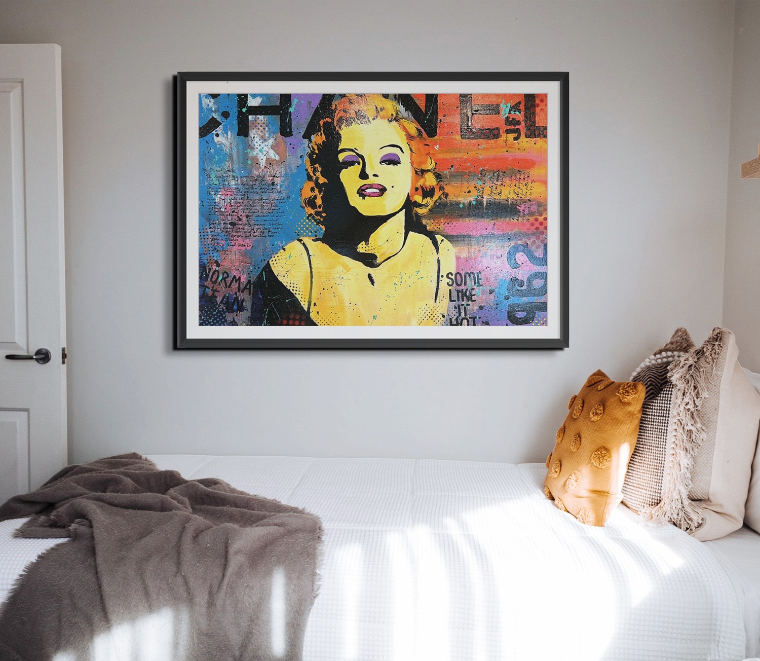 The artwork, a colorful pop art-style painting featuring Marilyn Monroe, mmediately captures the viewer's attention with its bold use of color and dynamic composition. The choice of vibrant makeup and bright hair for the central figure creates a focal point that is both intriguing and energetic. This use of color not only defines the character but also evokes a sense of playfulness and vitality, staying true to the pop art tradition. The fusion of portraiture with graphic elements is particularly effective, as it juxtaposes the softness typically found in portraiture with the sharp lines and vivid hues of popular culture imagery, resulting in a striking and memorable visual impact.