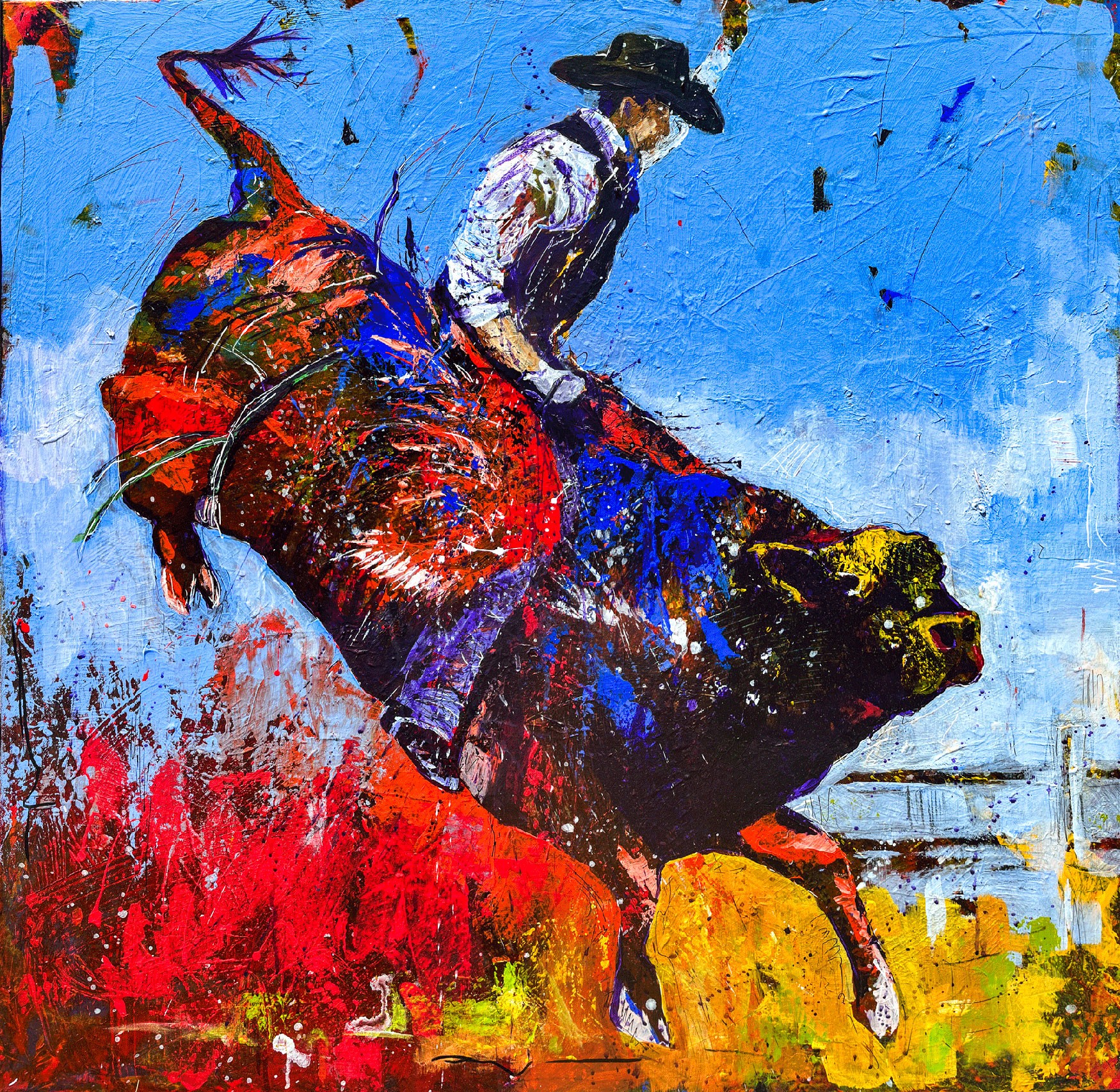 The artwork is a vibrant, dynamic painting of a rodeo scene. It features a bull rider skillfully mounted on a bucking bull. The rider is wearing a hat and vest, captured mid-action with one arm raised for balance. The bull is energetically depicted with a mix of bold colors, including blue, red, and yellow, emphasizing motion and intensity. The background is a bright blue, enhancing the vividness of the scene, while the ground is painted with warm hues of red, orange, and yellow, adding to the sense of energy and excitement. The entire piece is filled with textured brushstrokes, contributing to the sense of vibrancy and movement.