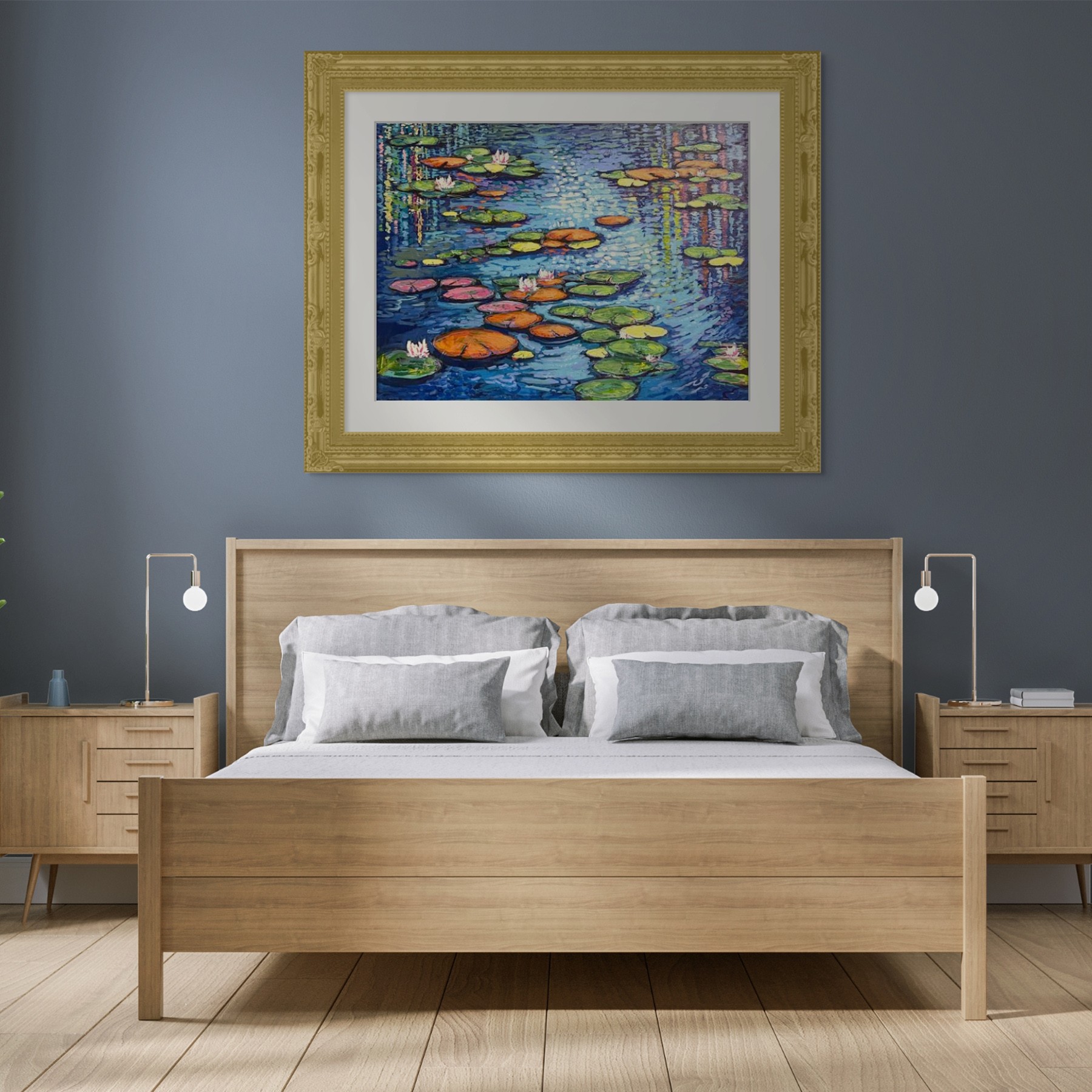 This painting of a pond adorned with lily pads and water lilies is a captivating engagement with both color and movement. Vibrant shades brings a harmonious yet dynamic quality to the canvas, truly capturing the essence and vitality of a natural water setting. The striking blues of the water impart a serene foundation that mirrors the play of light and surrounding colors, effectively creating a sense of depth and fluidity that draws the viewer in. The reflections achieved further animate the scene, bringing a sense of continuity between the water and its environment.